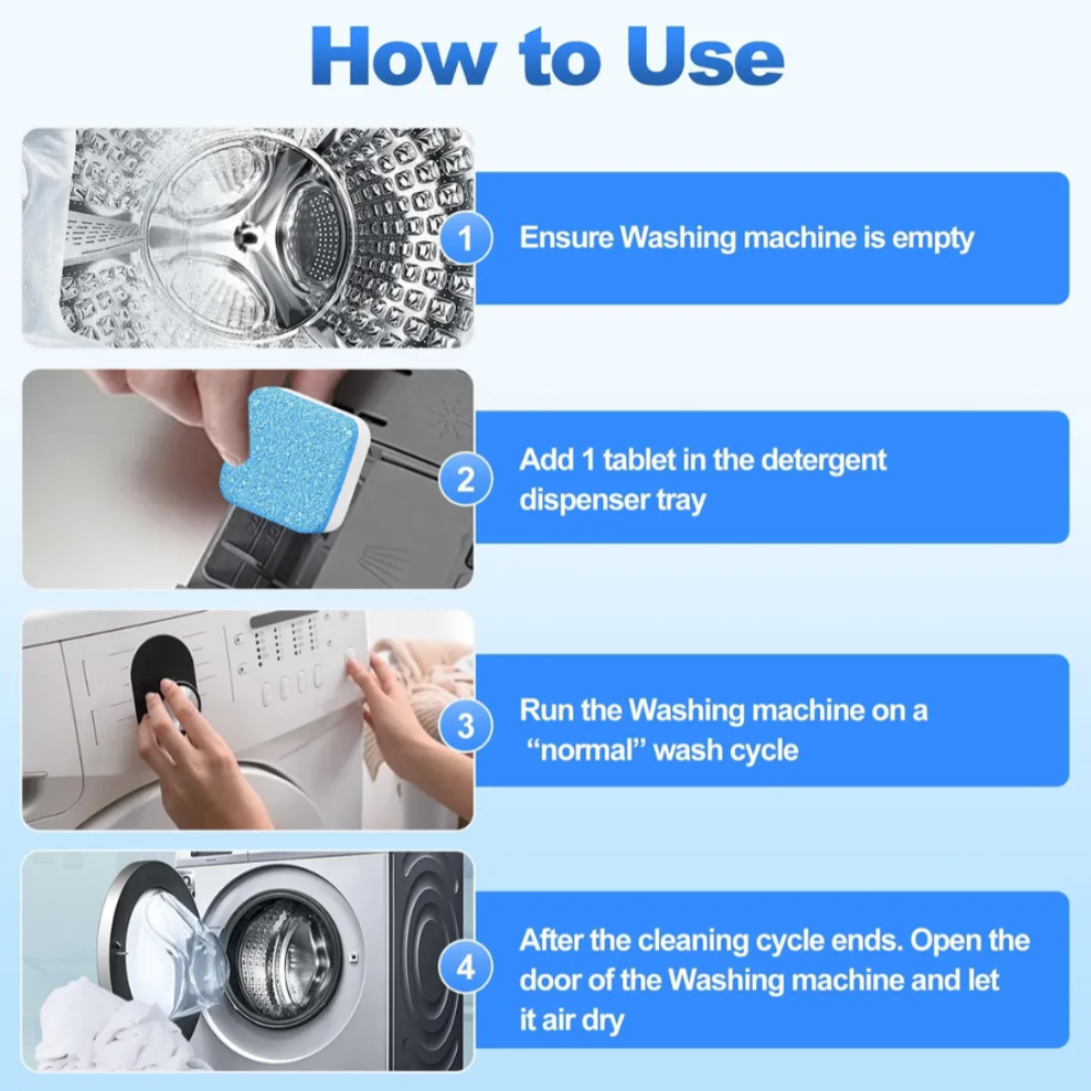 Solo necesitas colocar 1 o 2 tabletas, agregar agua y realizar un ciclo sencillo. Sin complicaciones ni herramientas especiales, tu lavadora quedará completamente limpia y lista para seguir funcionando de manera óptima.
