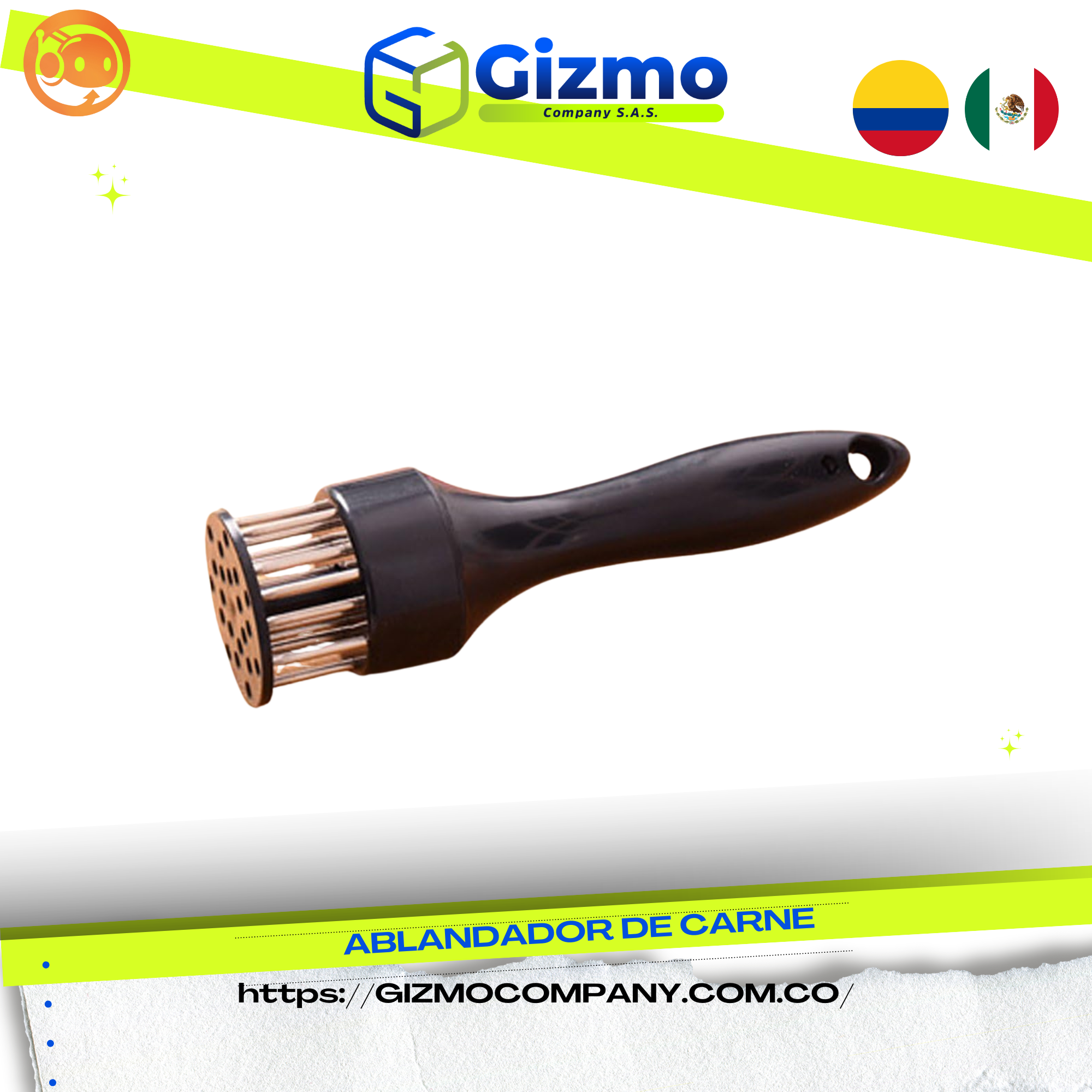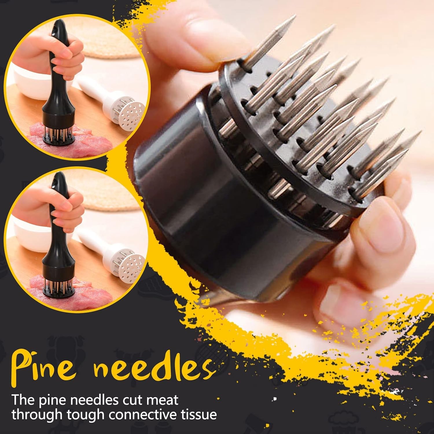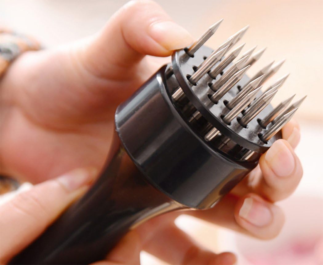 Su operación es sencilla y cómoda gracias al mango ergonómico con ranuras para los dedos, que permite un agarre firme y seguro durante el uso. Las cuchillas de acero inoxidable de grado alimentario penetran la carne de forma uniforme, mejorando la textura y facilitando la absorción de marinados.