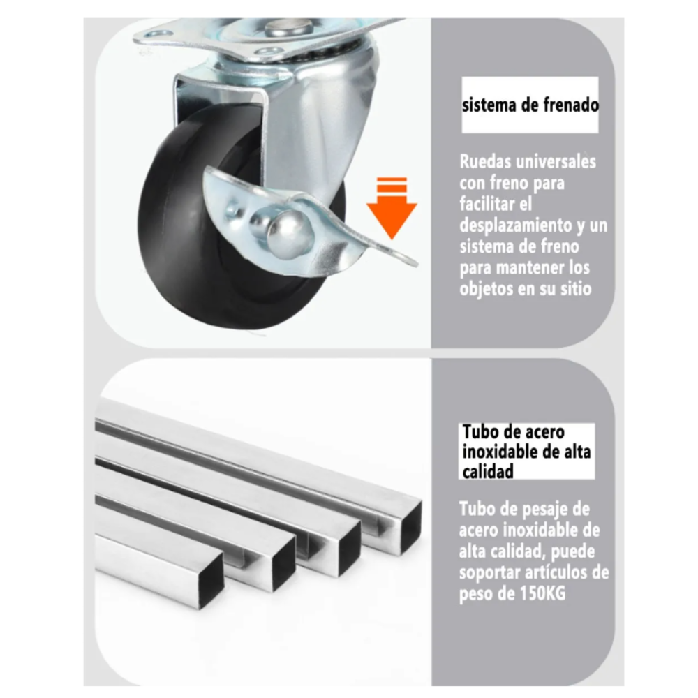 Fabricado con plástico de alta calidad, no tóxico y ecológico, combinado con acero inoxidable para mayor resistencia. Sus orificios de seguridad garantizan una colocación firme y un soporte de peso estable. Las ruedas de goma ofrecen mejor agarre que las ruedas plásticas tradicionales, reduciendo el impacto sobre el suelo, evitando daños y amortiguando el peso de objetos pesados.