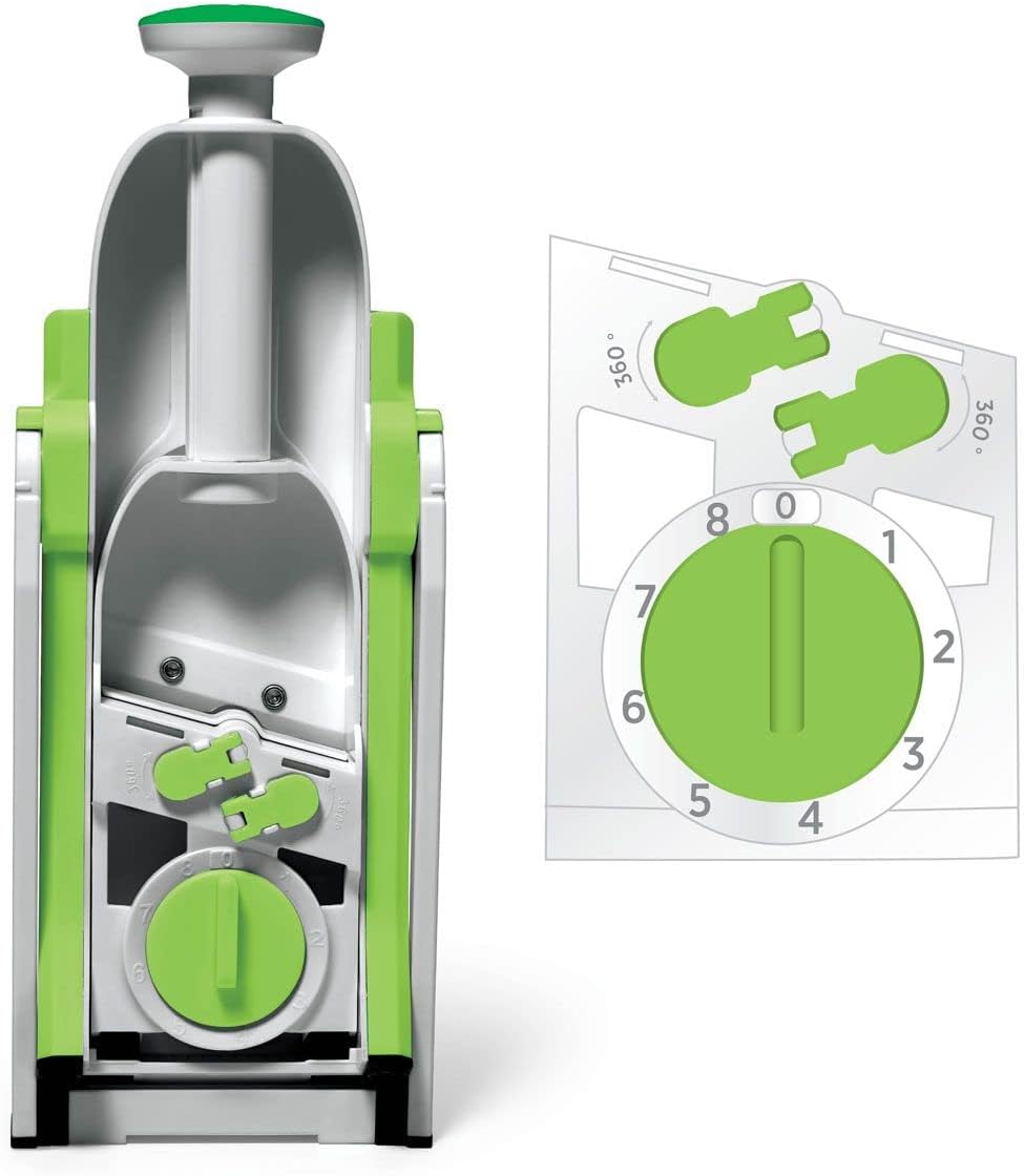 Este picador ofrece hasta 24 tipos de corte diferentes, que se ajustan fácilmente mediante una perilla giratoria, permitiendo cortar, rallar y rebanar verduras, frutas y carnes frías sin necesidad de cambiar múltiples piezas. Además, su funcionamiento es tan sencillo que puede ser utilizado por adultos mayores y niños bajo supervisión.