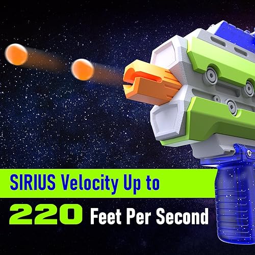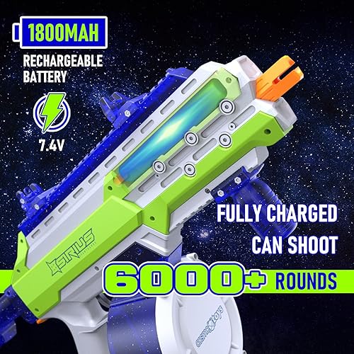 El diseño es robusto, con colores vibrantes y una estructura ergonómica para un agarre cómodo. Cuenta con modo automático, un tambor de alta capacidad y elementos desmontables que permiten personalizar la experiencia de juego.
