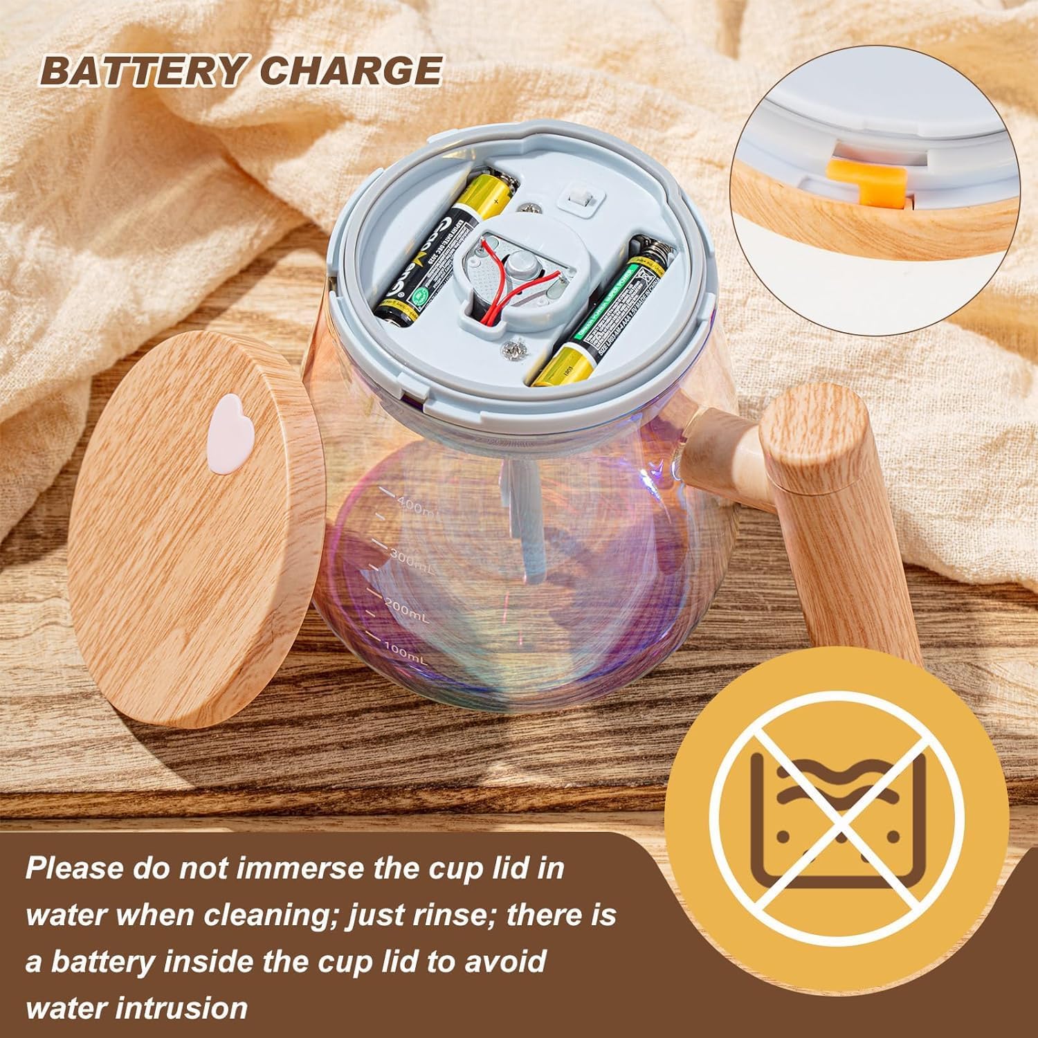 Está fabricada en vidrio de borosilicato de alta calidad, resistente a cambios bruscos de temperatura, soportando desde -30 °C hasta 150 °C, sin riesgo de estallido. Su exterior en plástico tipo madera aporta un diseño elegante y cómodo para el uso diario.